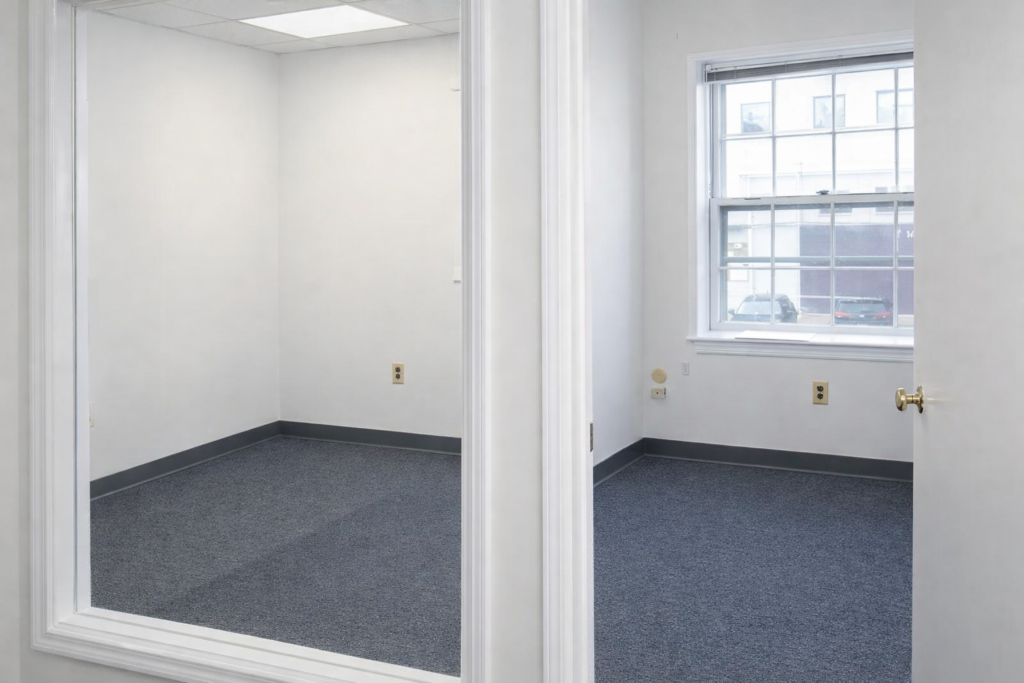 Office 3. Spacious private office with a glass wall that keeps the space open and a Bank Street–facing window that brings in abundant natural light – Suite 206